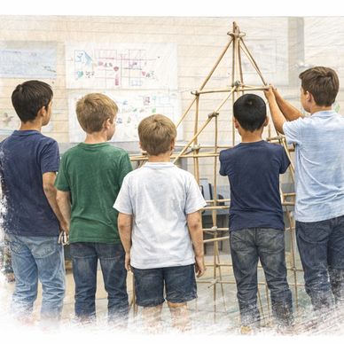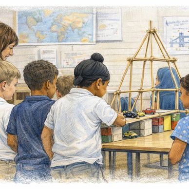A cross-curricular deep dive linking history, geography, maths, science, art and RE through ambitious large-scale builds. Pupils explore world architecture, design with geometry and symmetry, engineer for stability, and present their work in a walk-through exhibition.